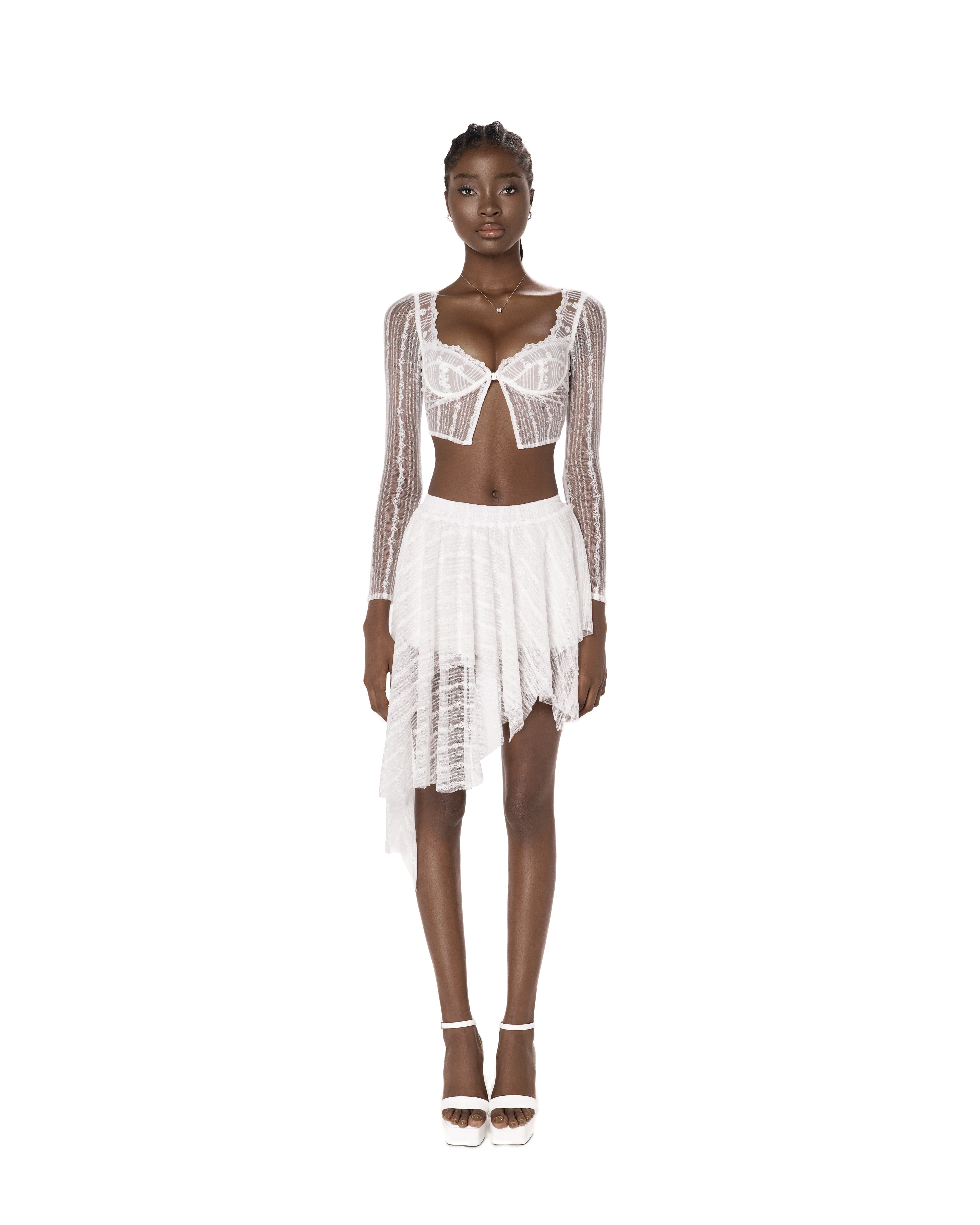 Tailored for forest nymphs and metropolitan muses, The Affetto Lace Skirt enchants with its whimsical asymmetric handkerchief hem, double layered cut, mid-rise waist, and delicately textured lace detailed with a beautiful hearts & bows print.