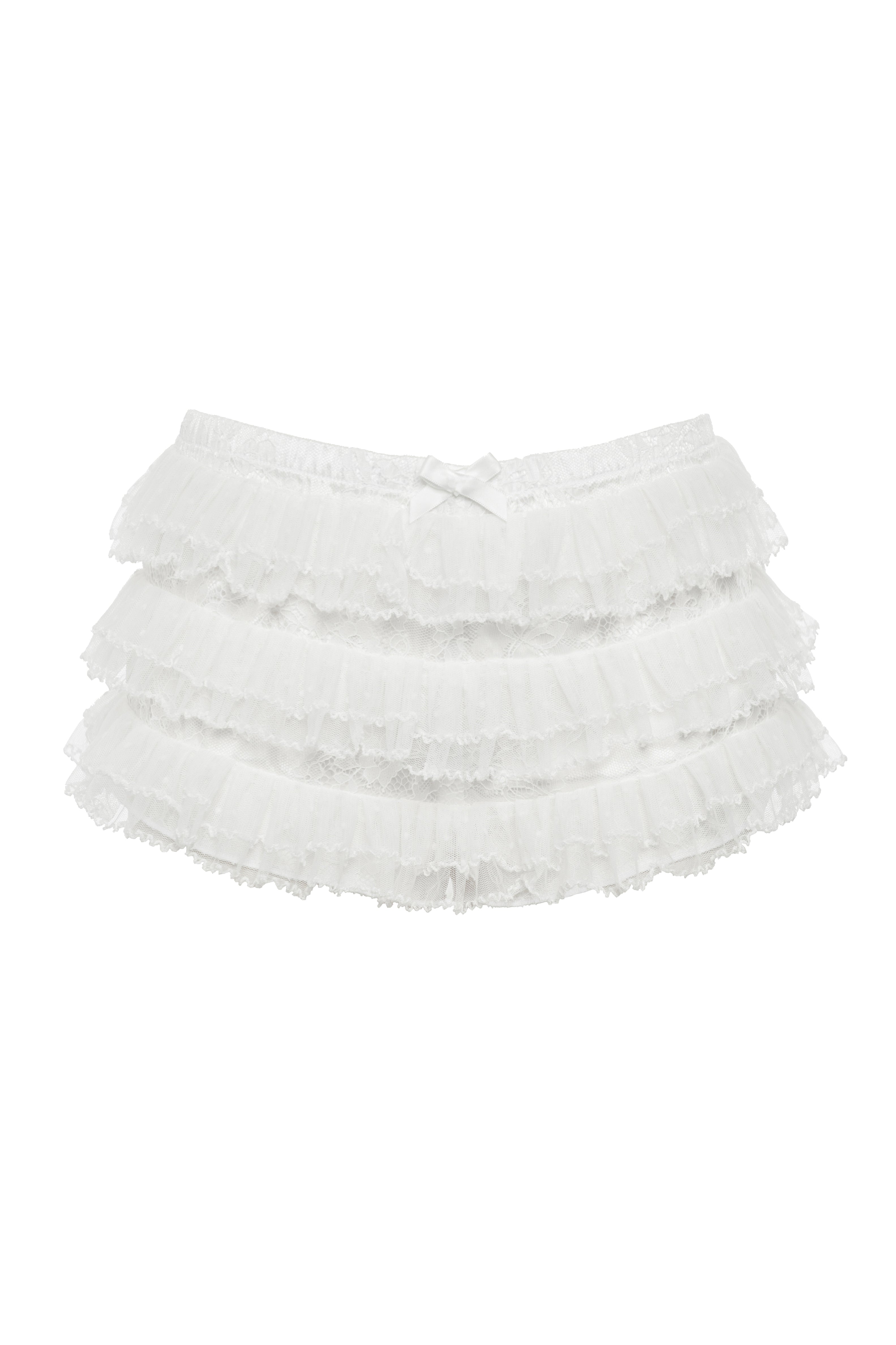 The Cherub Ruffle Bloomers channel angelic sweetness with a ruffled and layered look in French lace, a chic low waist and a sweet bow accent to the waist.