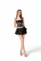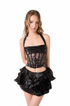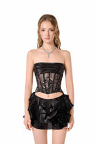 The Roselène Skirt is a sculptural masterpiece. It features a dramatic hand-draped rosette blooming along the hip, with cascading layers of glossy black organza that mimic fluttering petals.