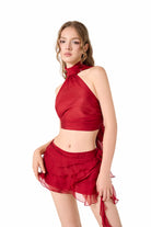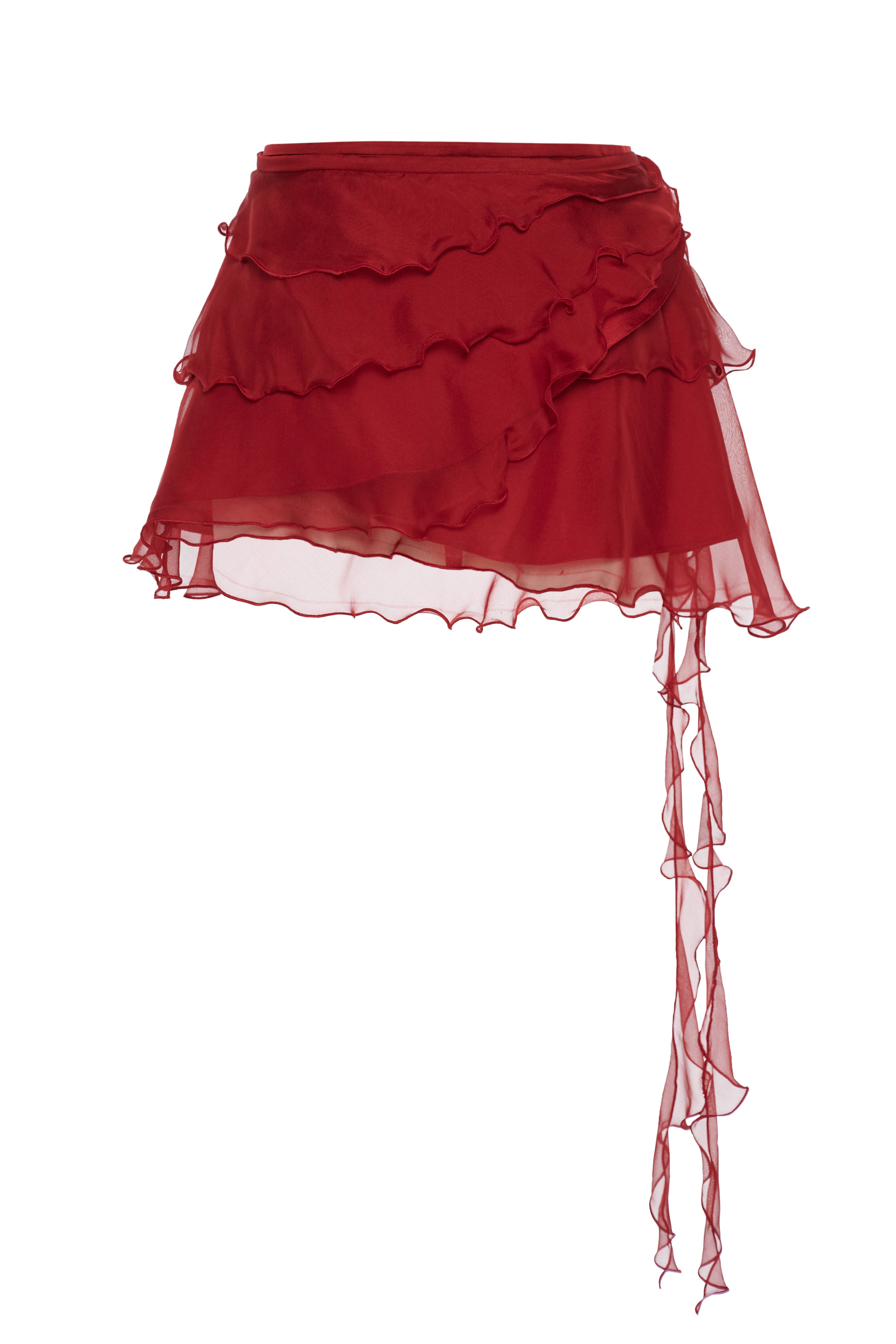 Meet the dreamy Volante Silk Chiffon Skirt in dark red, a whimsical creation featuring a ballerina wrap design, gentle ruffles and an asymmetric hemline that radiates coquette vibes. Complete your ensemble with the Volante Silk Chiffon Top for the ultimate look.