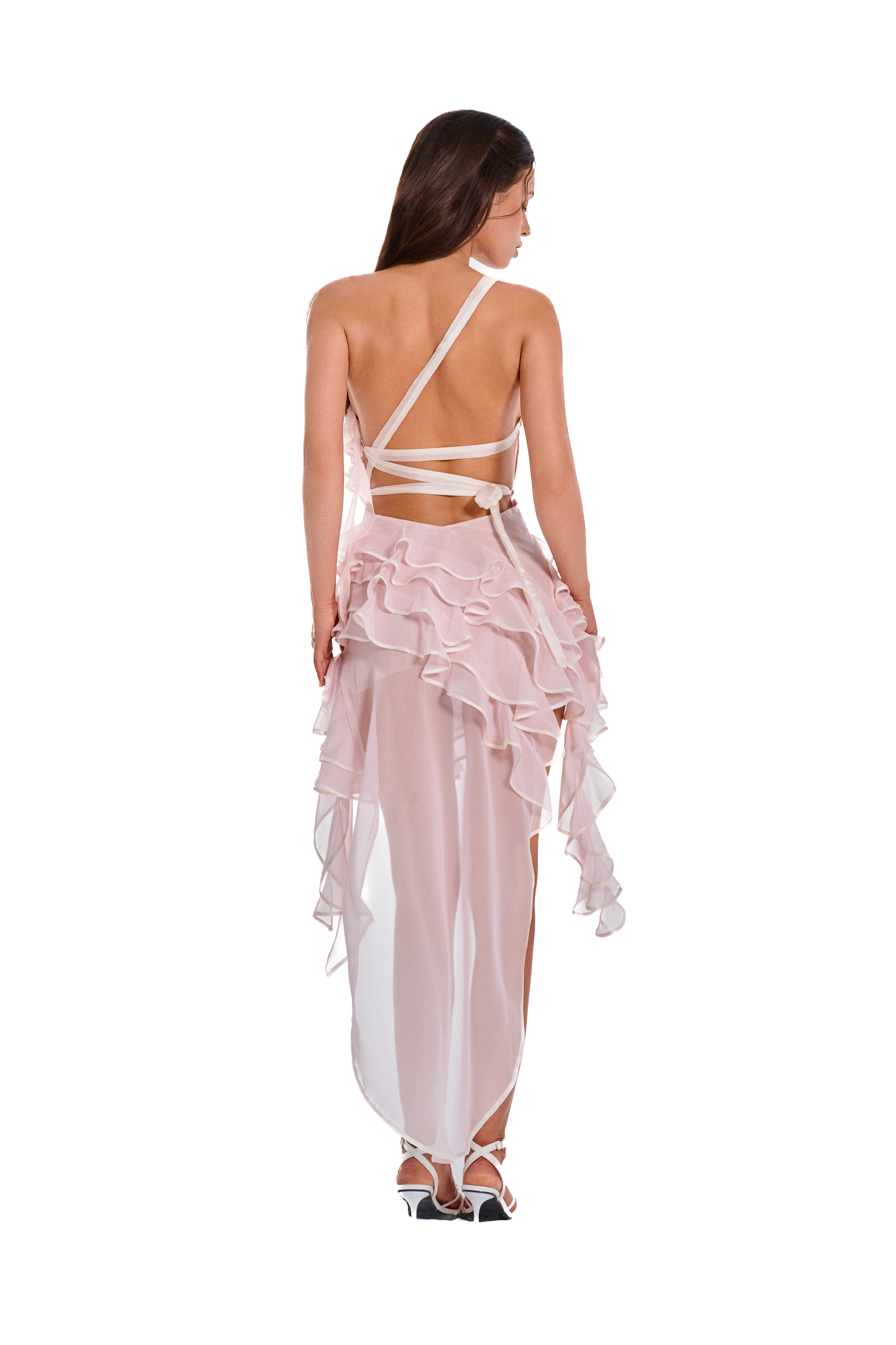 Our most intricate creation yet—crafted entirely by hand over three days. A masterpiece of cascading, asymmetrical ruffles in sheer blush organza, layered across a nude mesh base for an ethereal effect (solid lining available upon request). Finished with a delicate, handmade rosette at the shoulder and sculpted with an open-back wrap silhouette.