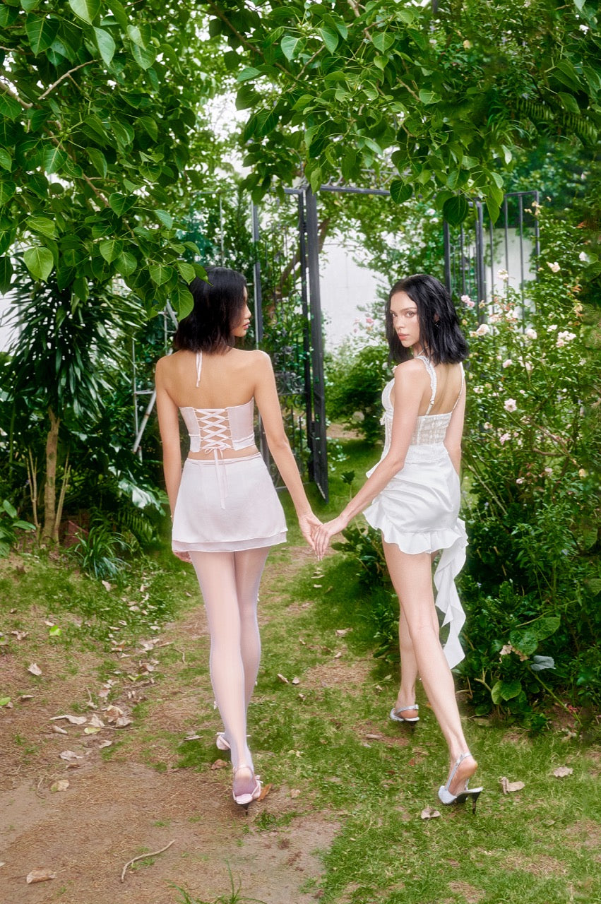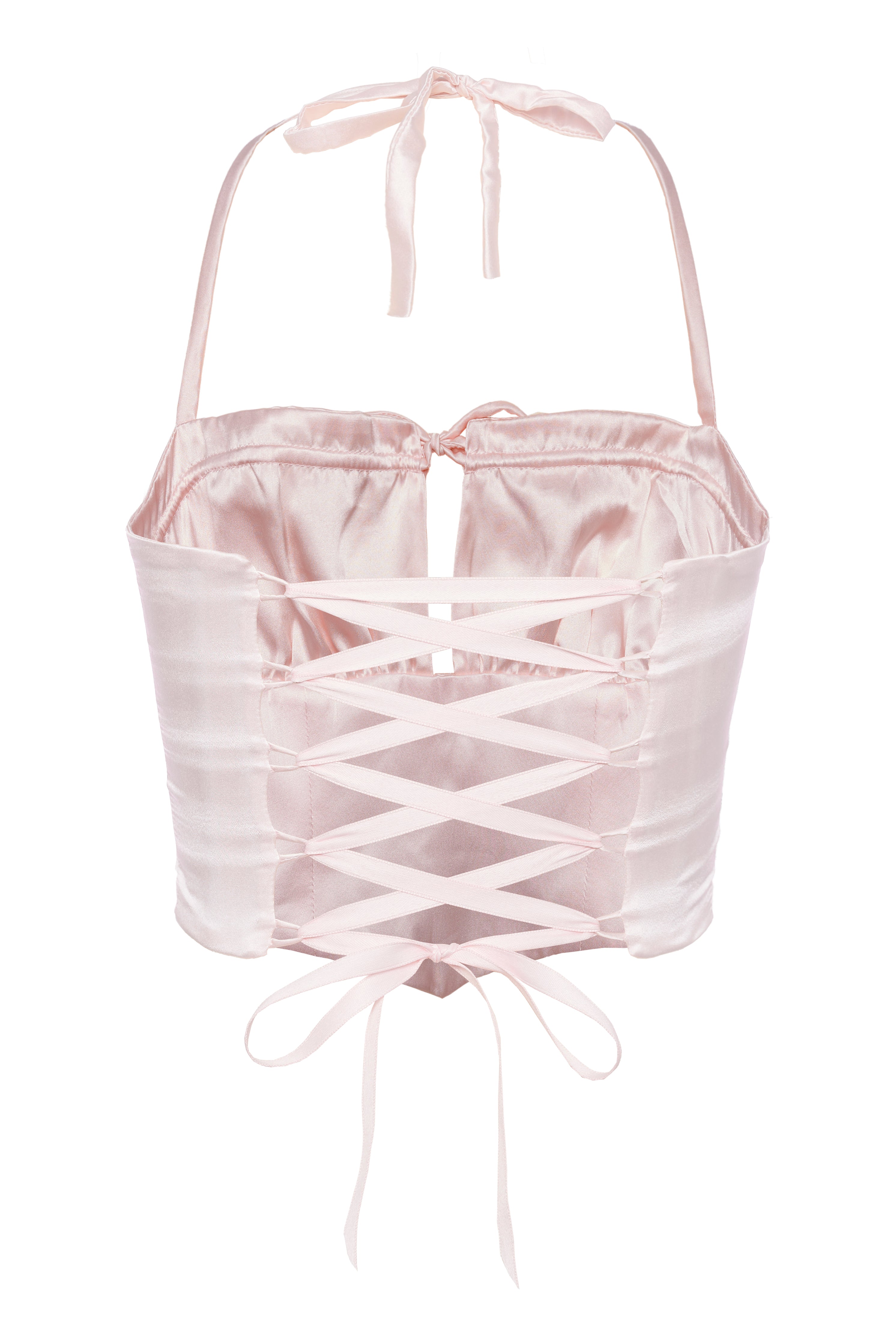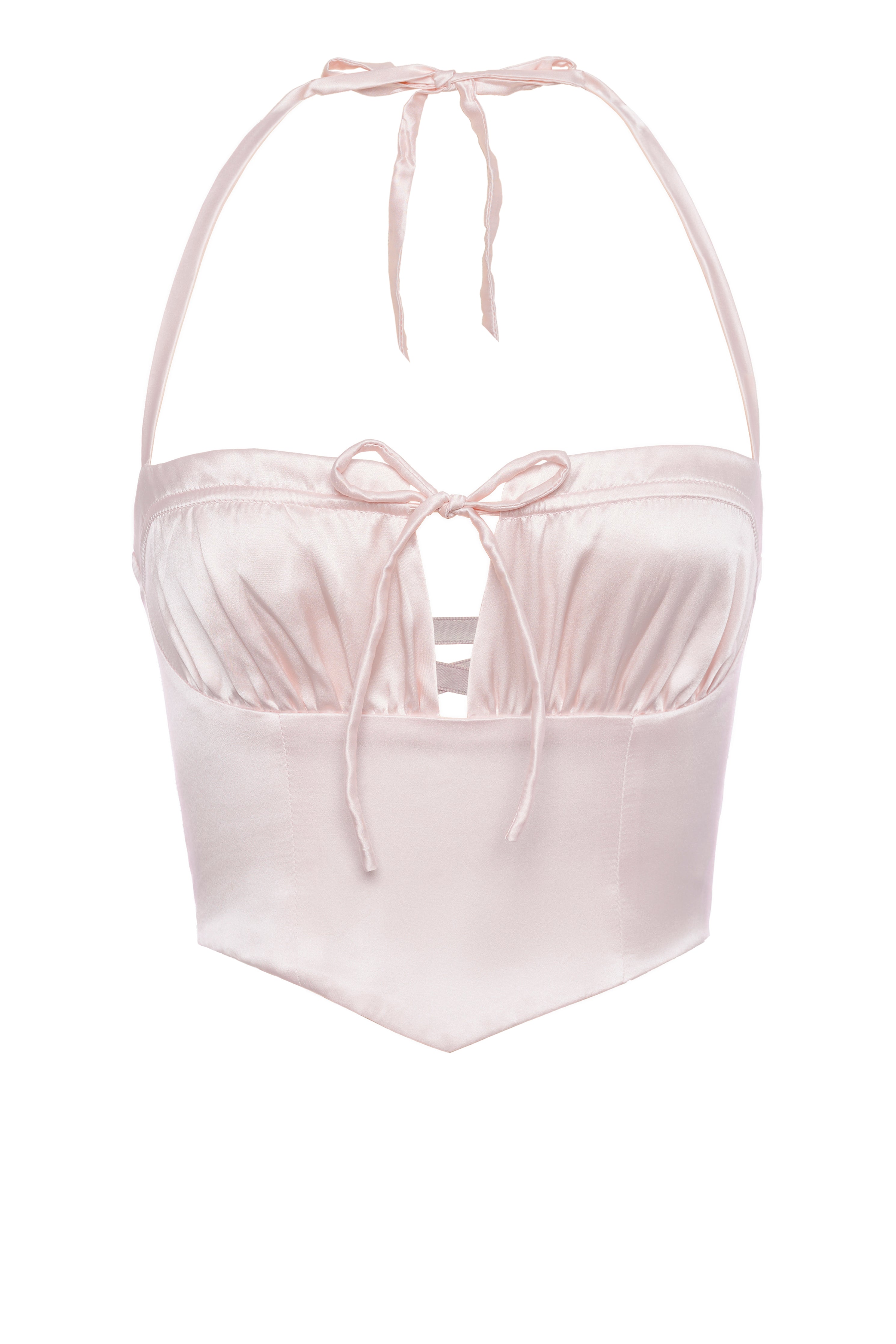 A delicate coquette moment unfolds with The Aria Silk Satin Corset, a sweet and feminine piece detailed with a ruched bust, a V-shaped waist, and a lace-up ribbon back.