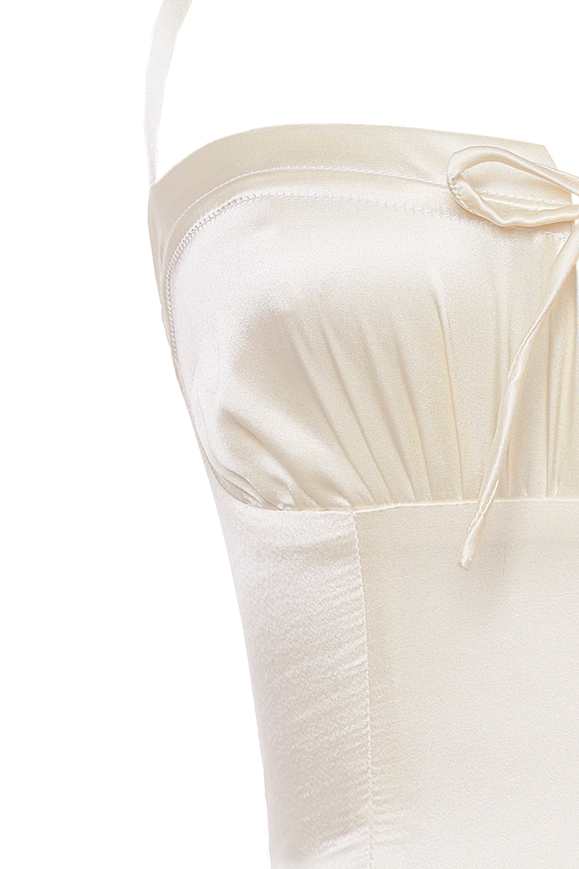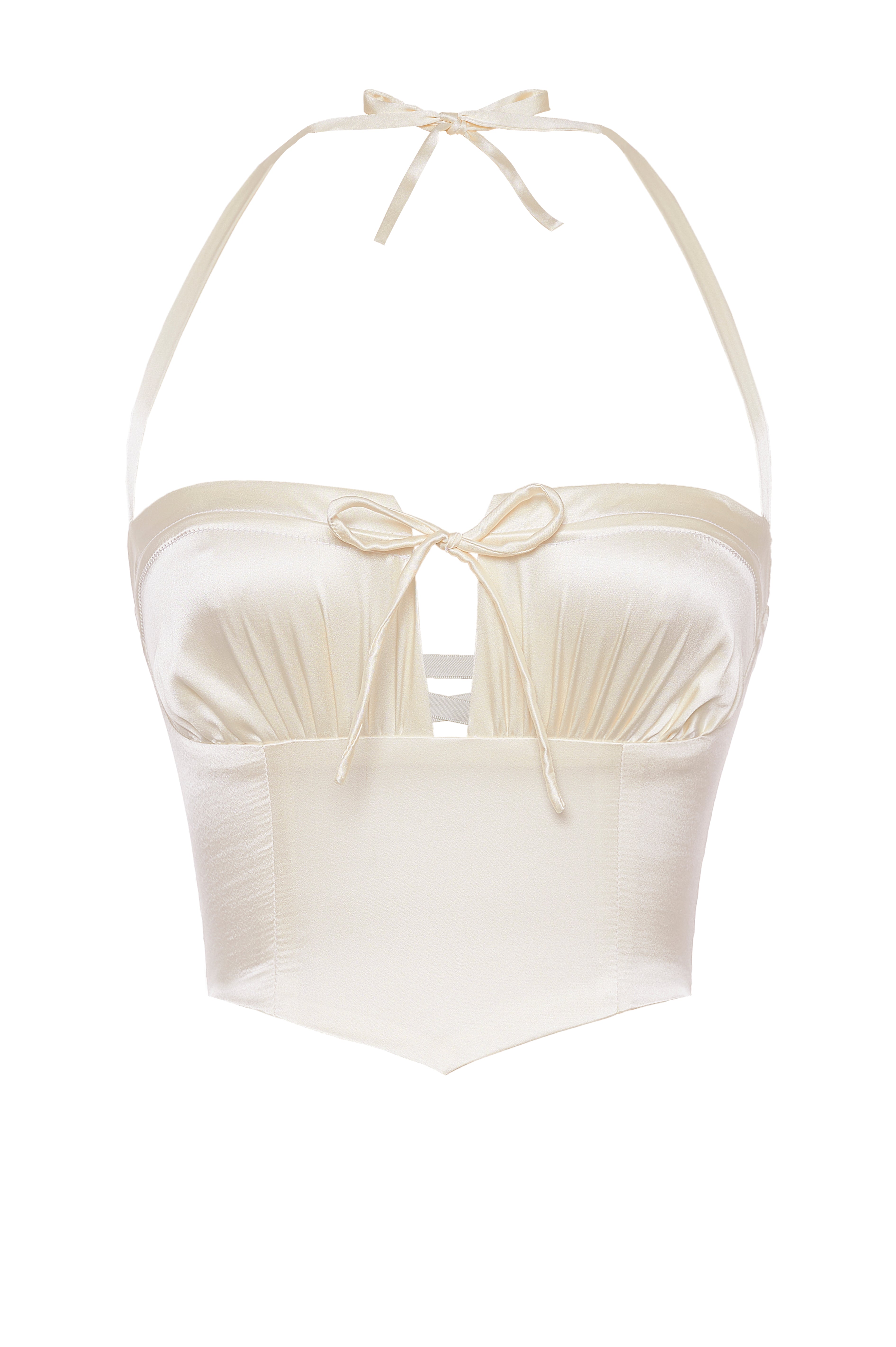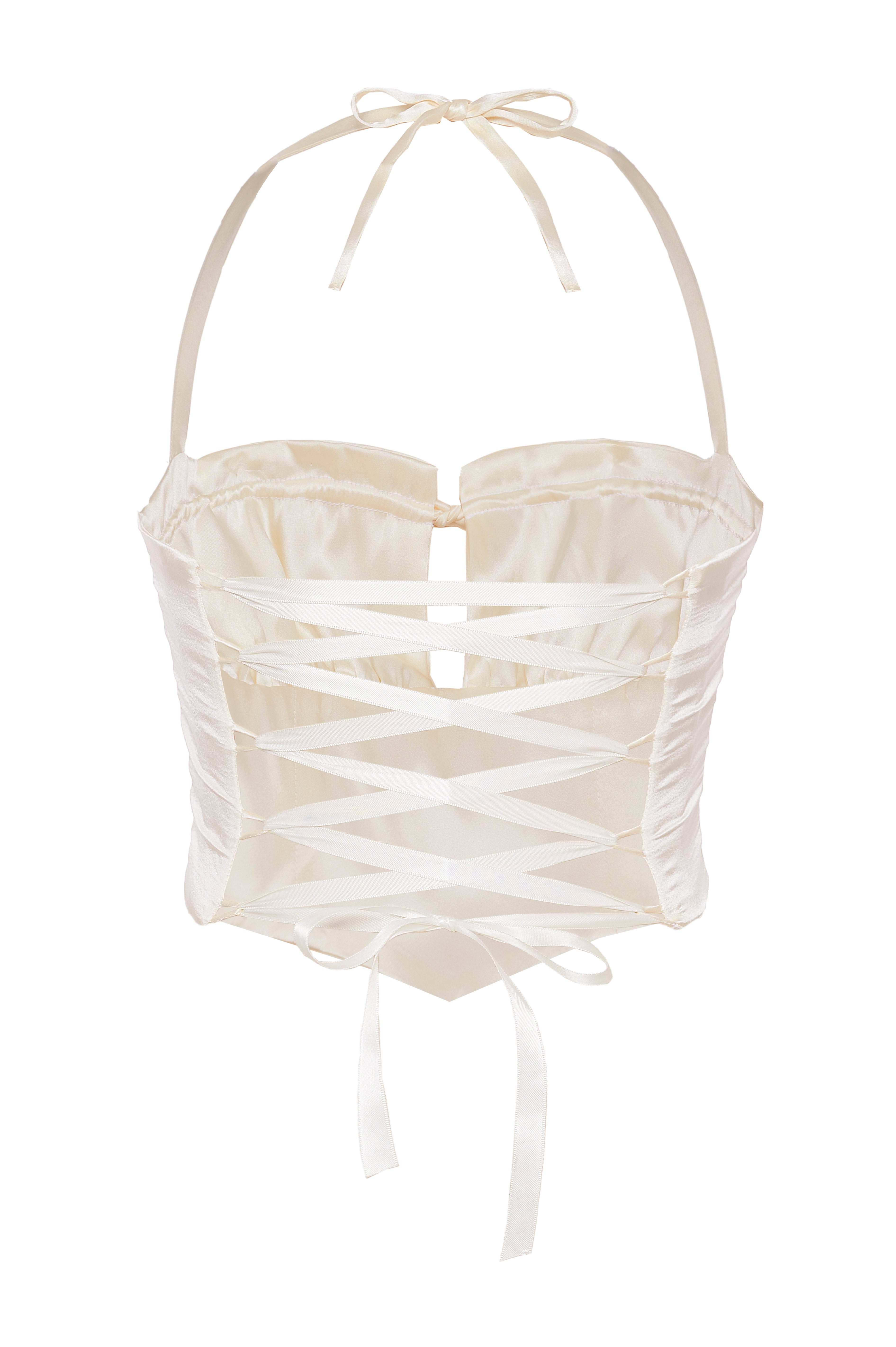A delicate coquette moment unfolds with The Aria Silk Satin Corset, a sweet and feminine piece detailed with a ruched bust, a V-shaped waist, and a lace-up ribbon back.