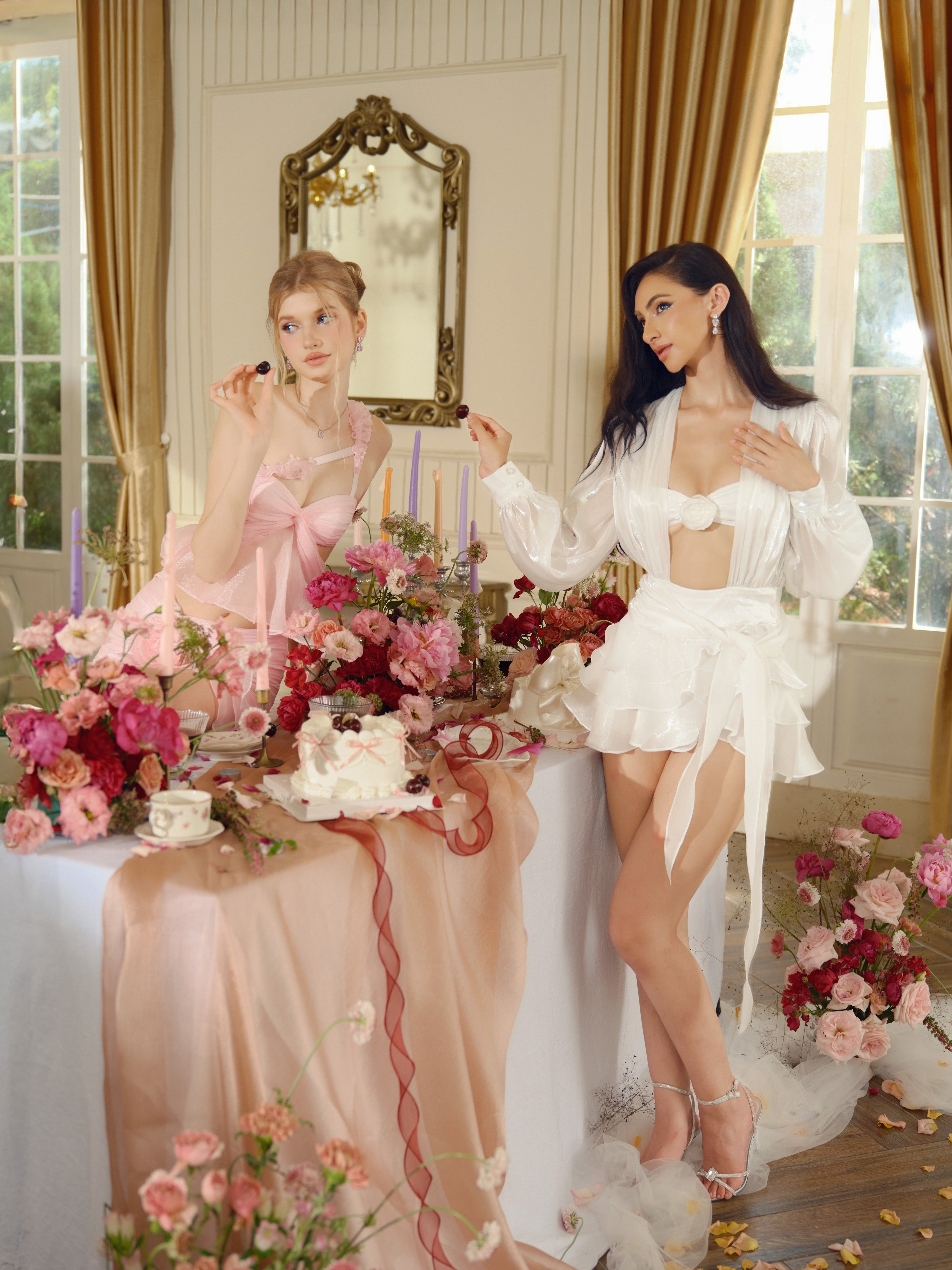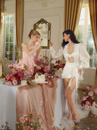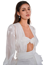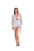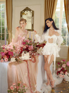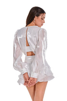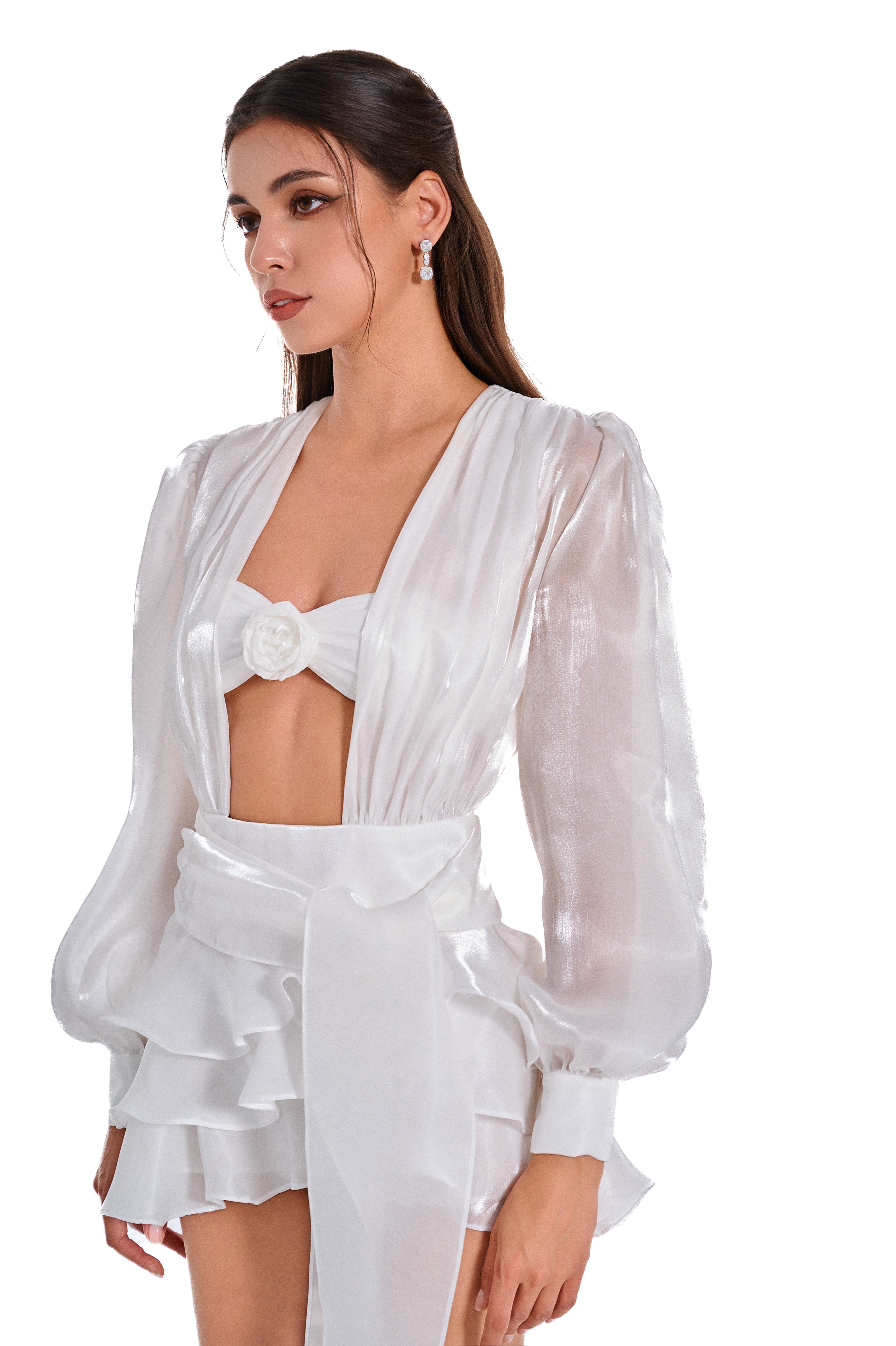 A dreamy ivory mini dress made from glossy organza that glistens like morning dew. The set includes a sheer draped overlay and a bandeau top adorned with a handmade rosette. Finished with a layered petal-like skirt and flowing waist tie—soft, sculptural, and luminous.